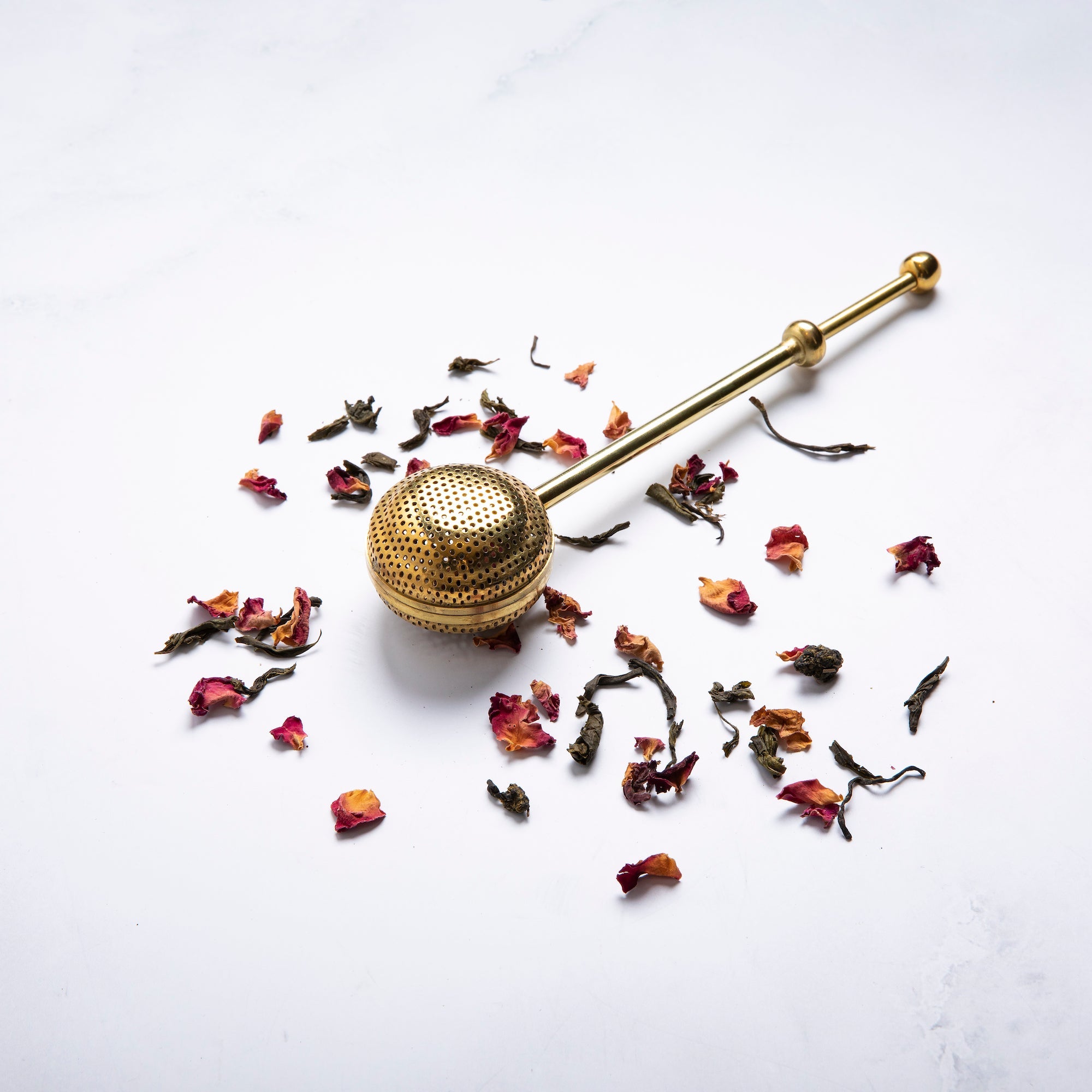 A convenient and stylish telescopic shaped tea infuser attached to a flat ball. The ball can be opened in two halves by pressing a spring operated lever in the handle, and closed after putting the tea leaves. The infuser is put in the hot water for the required time and taken out while tea leaves remain inside the ball. The tea leaves in the infuser can be easily reused by repeating the same process. Suitable for 1-2 cups of tea.