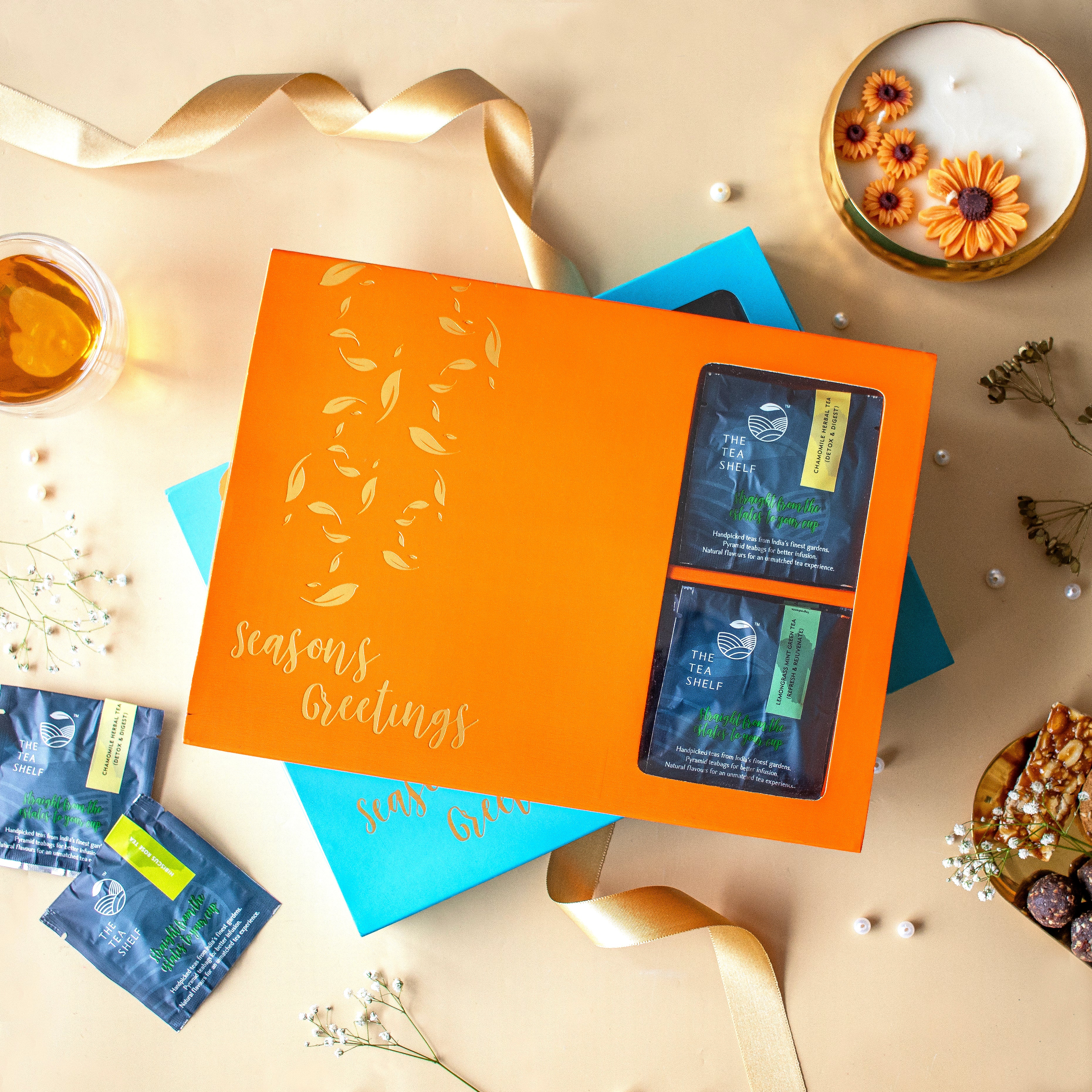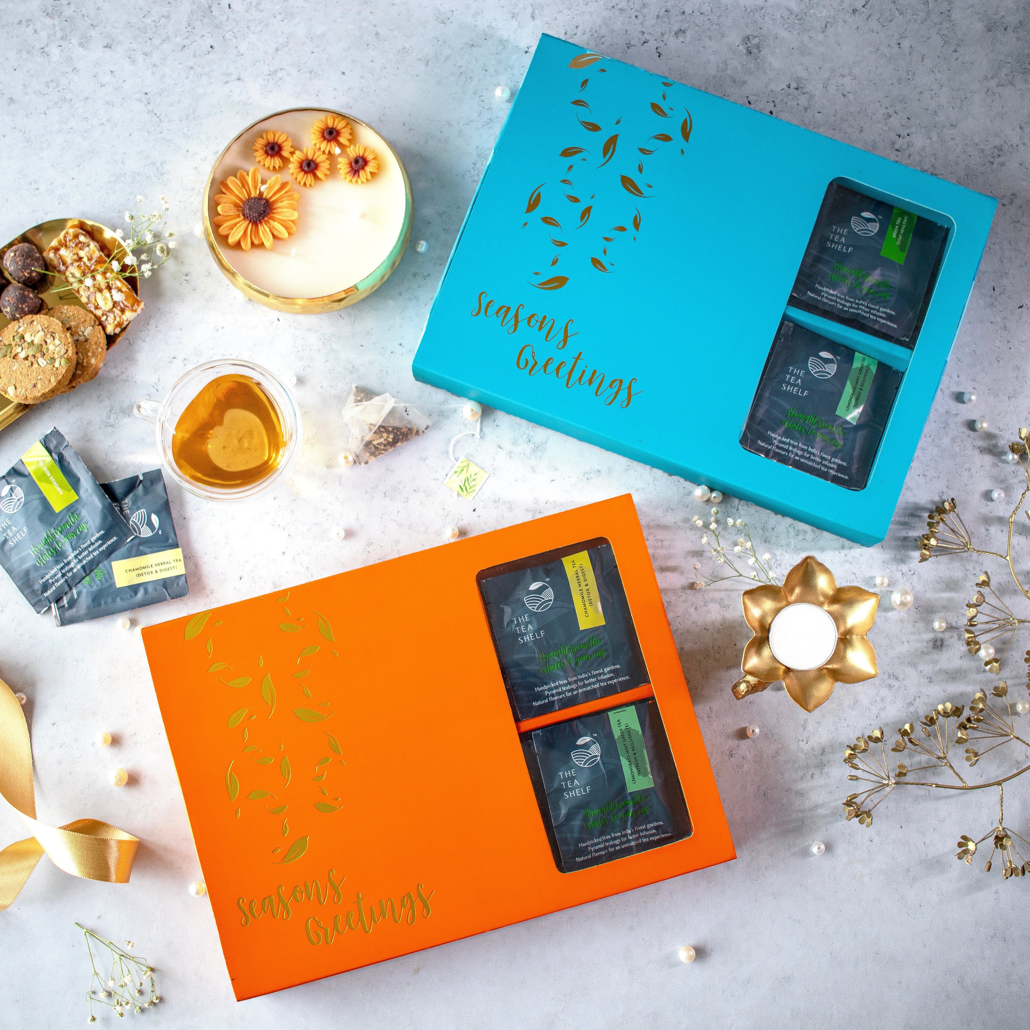 Tea Selection - Chamomile Herbal Tea, English Breakfast Black Tea, Winter Forest Green Tea, Rose Tulsi Green Tea, Lemongrass Mint Green Tea and Immunity Booster Herbal Tea.